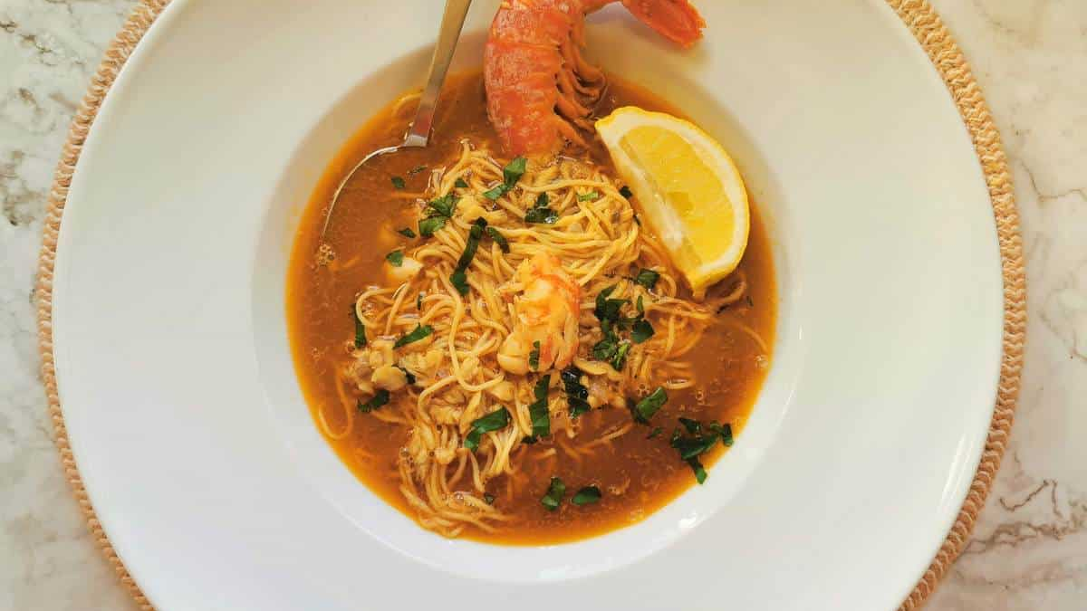 This outstandingly delicious Italian fish soup is served with fried angel hair pasta, fresh parsley, lemon juice, and sautéed prawns.