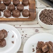 - Working quickly, use a spoon to dip each ball into the melted chocolate. Gently tap off the excess chocolate on the side of the bowl.