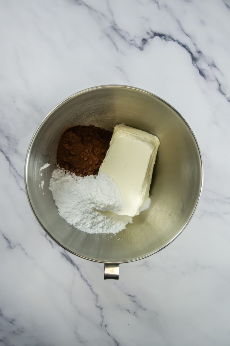 - In a stand mixer or large mixing bowl, combine softened cream cheese, powdered sugar, cocoa powder, vanilla, and salt. Mix on low speed until well combined, scraping down the sides as needed.
