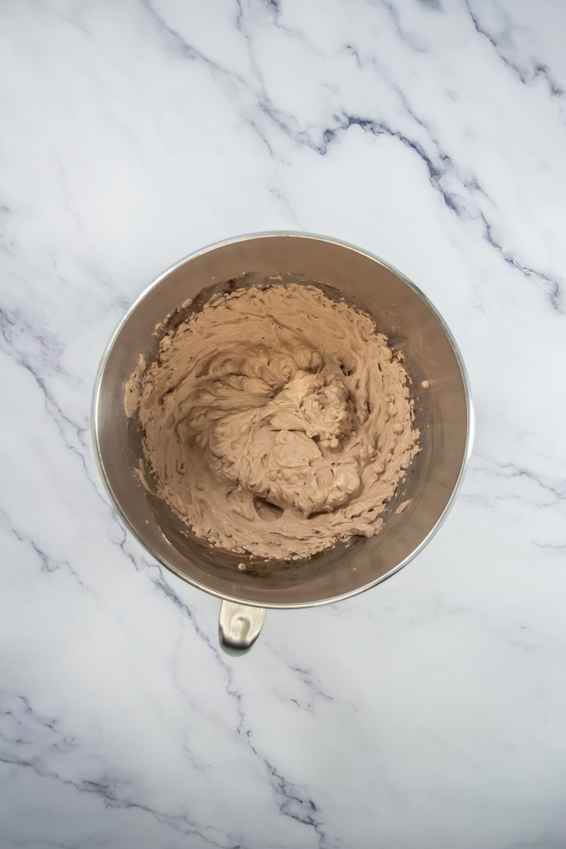- In a clean mixing bowl, beat the heavy cream on medium speed until soft peaks form. Add powdered sugar, cocoa powder, and Baileys.