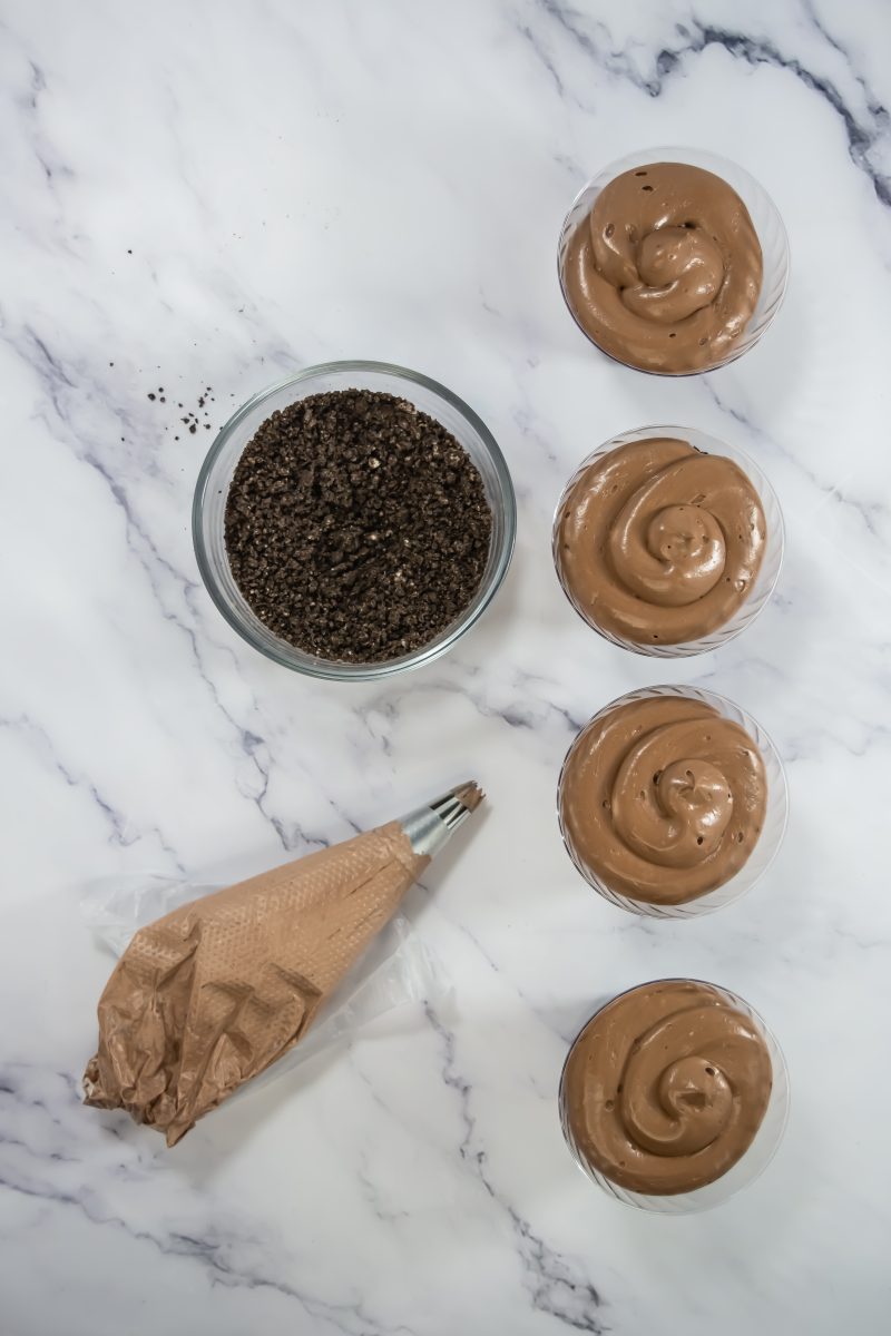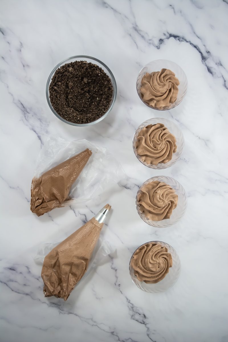 Add about 1 tablespoon of crushed Oreos to the bottom of each trifle cup or jar.