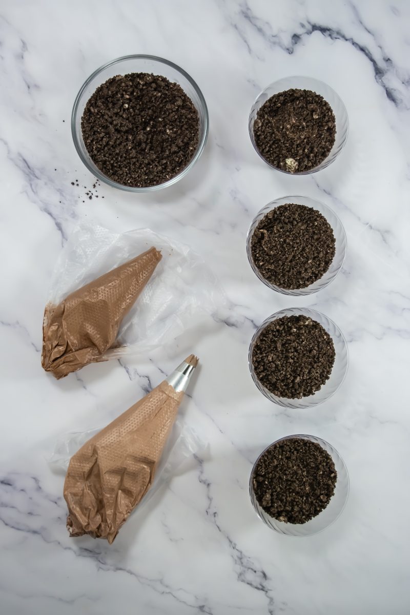 - Add about 1 tablespoon of crushed Oreos to the bottom of each trifle cup or jar.
