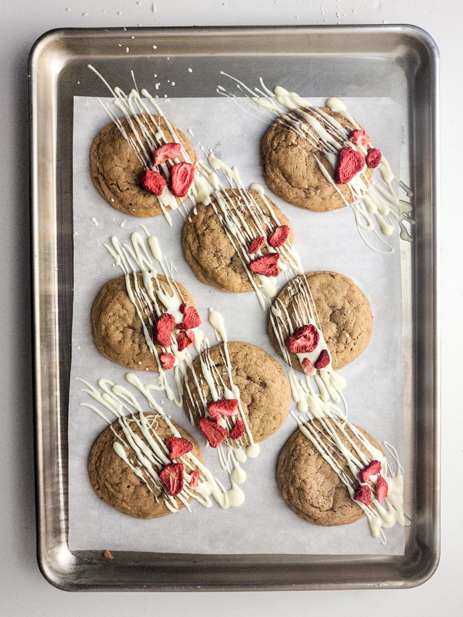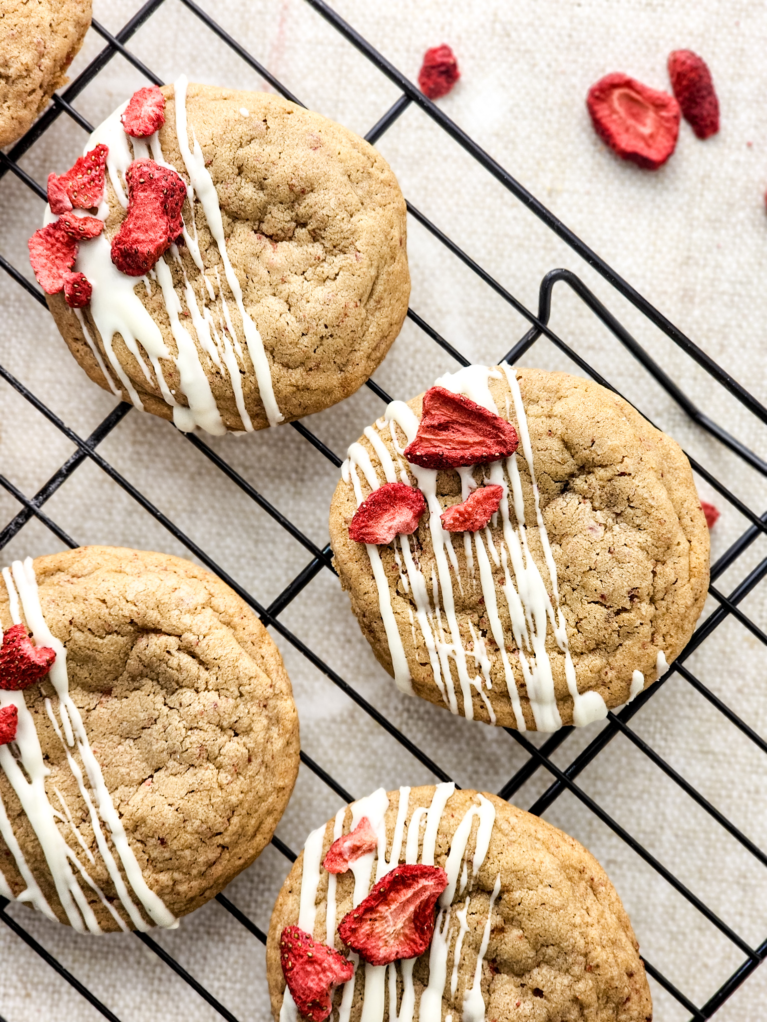 Drizzle the white chocolate diagonally over half of each strawberry cheesecake cookie and place the frozen dried strawberry pieces on top of the cookies.