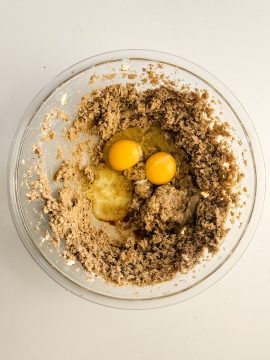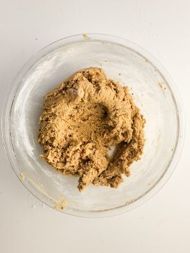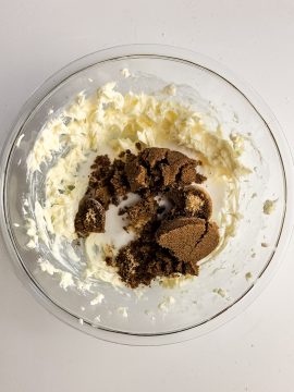 Prepare a baking sheet with parchment paper and set aside. In a mixing bowl, add the butter, sugar and brown sugar. Use a hand mixer to blend the ingredients together until creamy.