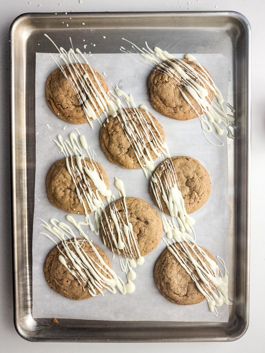 Bake in the oven for 13-15 minutes or until the center has puffed and the edges of the cookies have slightly browned. Remove from the oven and let cool for 10 minutes. While those cool, heat the white chocolate in the microwave at 30 second intervals until melted.