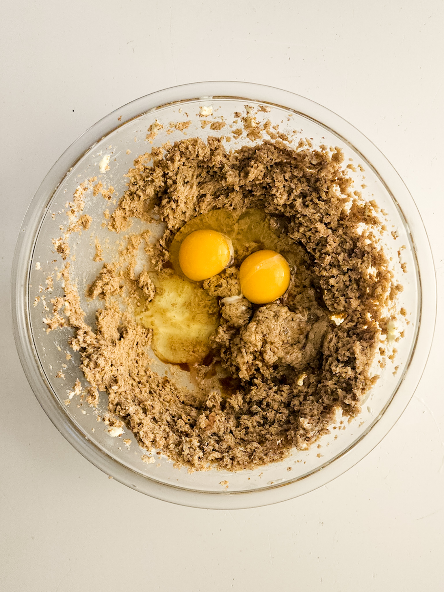 - Use a rubber spatula to fold all the ingredients together and distribute them evenly until a thick batter is formed. Wrap in plastic wrap and place in the fridge. While the dough chills, make the cheesecake filling.