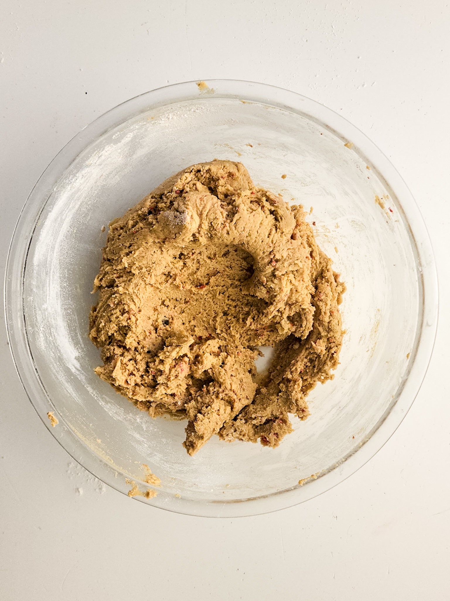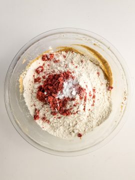 Pour in the flour, baking soda, salt and crushed dried strawberries. Use a rubber spatula to fold all the ingredients together and distribute them evenly until a thick batter is formed.