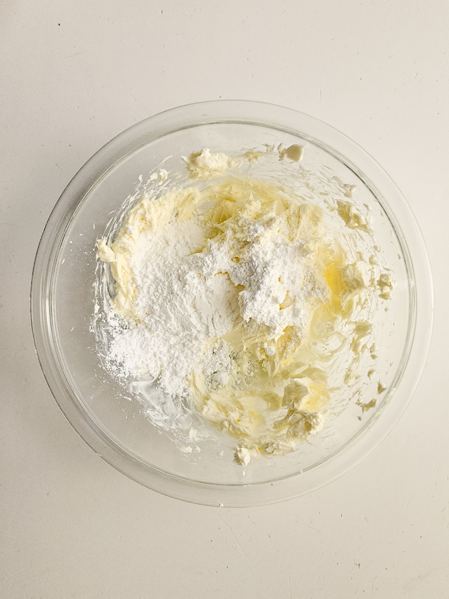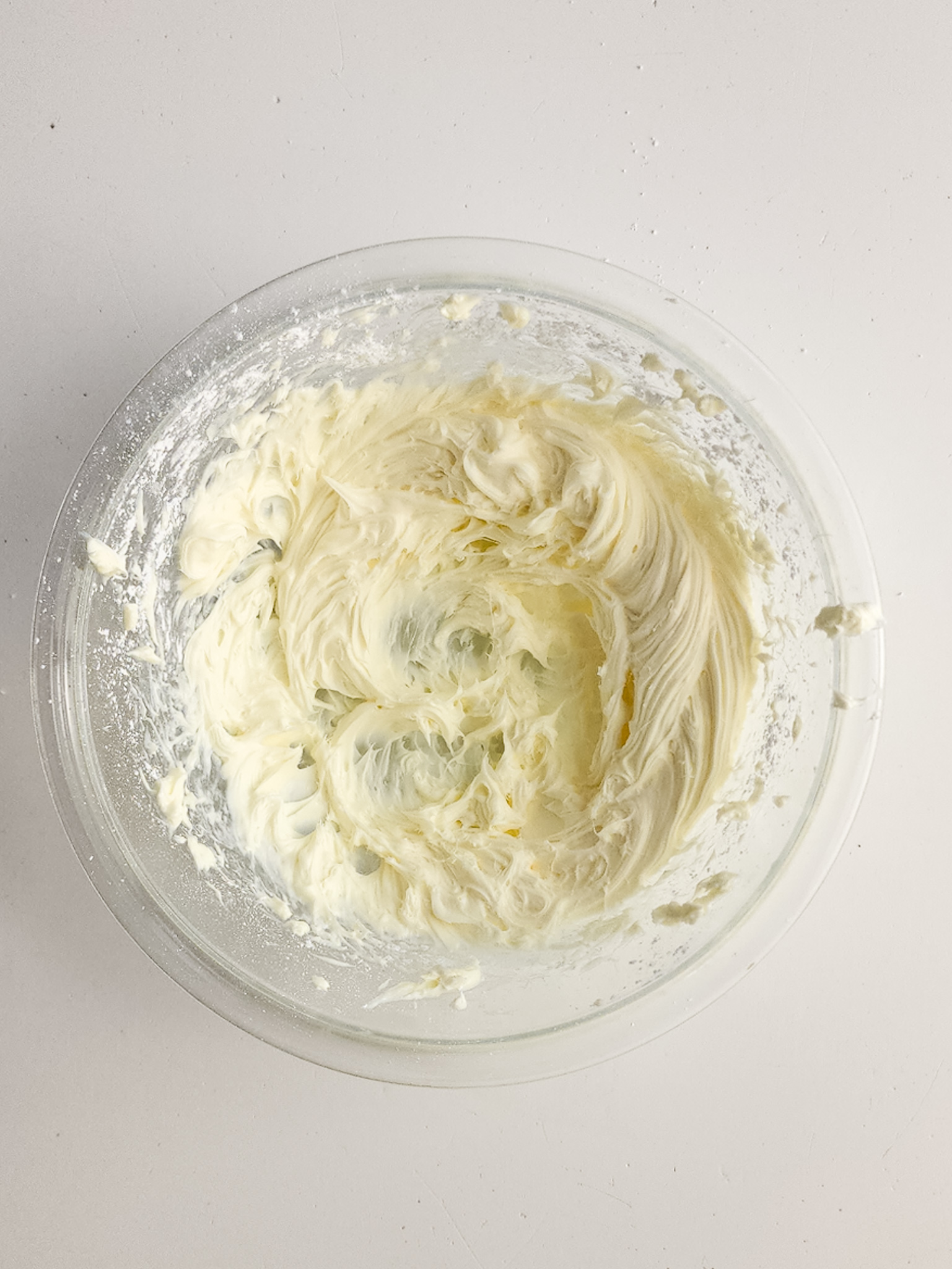 - In a separate smaller bowl, blend the cream cheese until creamy. Then add the powdered sugar, blending again until smooth.