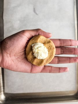 Wrap the cookie dough around the cream cheese and roll into a ball. Place on the prepared baking sheet from earlier. Repeat with the rest of the dough balls and keep each about 2 inches apart when placing on the baking sheet.
