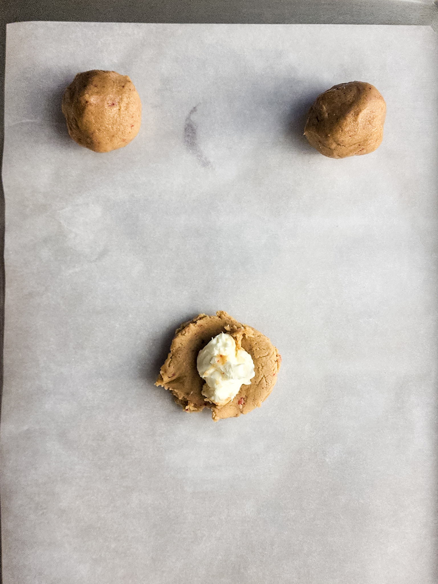 - Place a large teaspoonful of the cream cheese filling on a parchment covered plate or small baking sheet. Repeat and fill the parchment paper until all the cream cheese filling is gone. Place the baking sheet in the freezer and let them harden along with the chilling of the cookie dough for 30 minutes. Remove both from the freezer and fridge. Preheat the oven to 350 degrees Fahrenheit.
